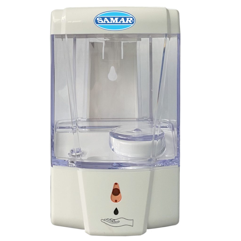 Dispenser automatico di sapone e gel mani con fotocellula. L’erogazione avviene senza contatto tra le mani ed oggetti esterni.